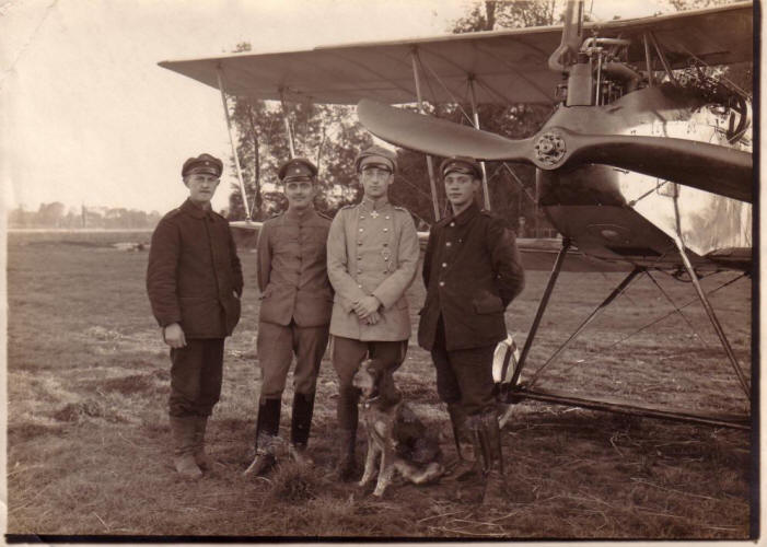 Oberleutnant Ernst Freiherr von Althaus mit seinem "Burschen" und zwei Flugzeugwarten vor seinem Kampfflugzeug.